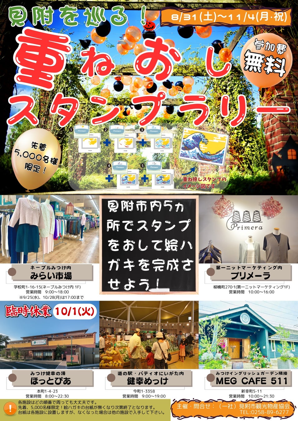 見附市観光物産協会は、8 月 31 日(土)~11 月 4 日(月・祝)にかけて「~見附を巡る~重ねおしスタ ンプラリー」を開催します。重ねおしスタンプラリーとは、予め設定されたスタンプポイントを周り、 それぞれの箇所で様々な色のスタンプを重ねて捺していくことで、最終的にカラフルな絵葉書が完成す るというものです!近年、全国の観光地やイベント等で開催され、好評を博しています。少しずつ絵が 出来上がっていくワクワク感や最後に全貌が現れた時の達成感を感じることができますよ。