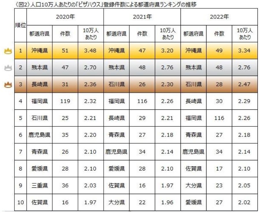 人口10万人あたりのピザ店の登録件数において、2020年から2022年の3年連続での1位は沖縄県、2位が熊本県でした。