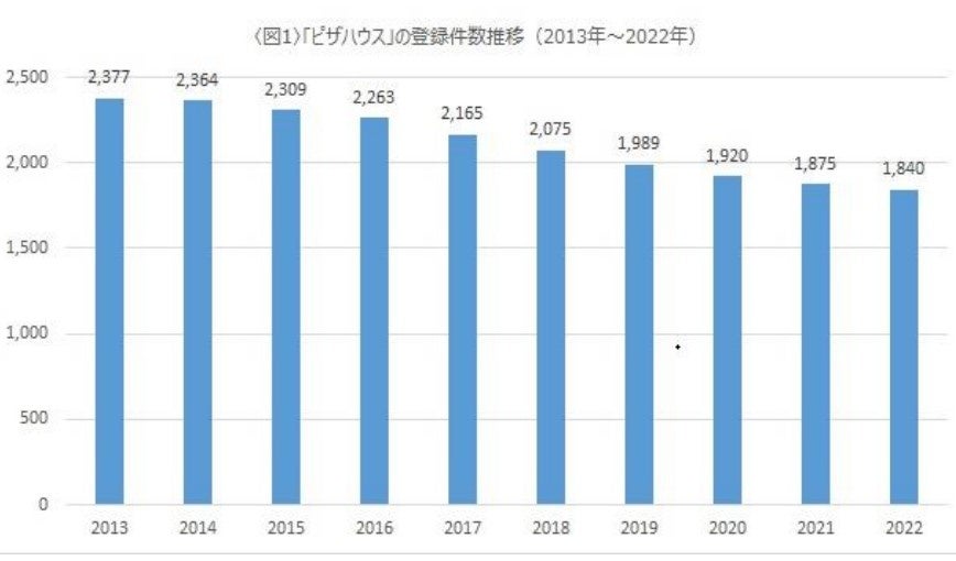 2013年より毎年減少を続けている全国のピザ店の登録件数ですが、コロナ禍を経てようやく減少幅が小さくなりました。小規模でデリバリーに対応できる非接触型の業態が時代にあっているピザ店、今後の伸びが期待できそうです。