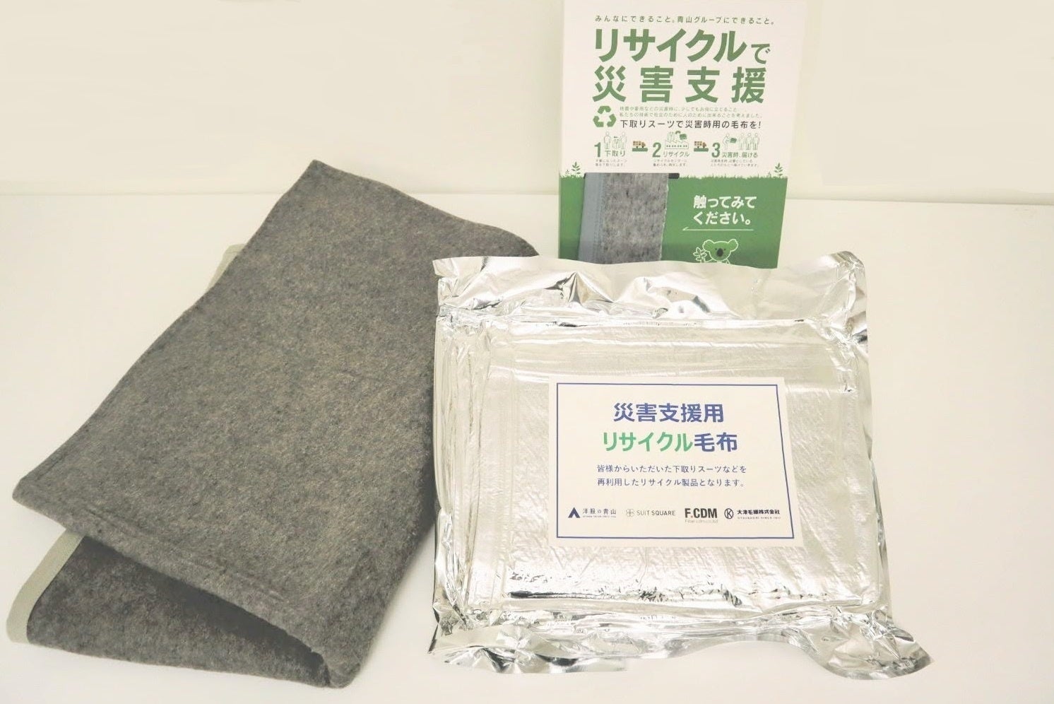 防災毛布は、店頭で回収したスーツ等の一部をリサイクルしています。当社では、お客様と協同するエコ活動の一環として、使用済みの衣料品を「洋服の青山」「スーツスクエア」などで回収しています。回収した衣類はリユース・リサイクルによって約99%再利用しており、2018年からは近年の全国的な自然災害の激甚化・頻発化を鑑みて防災毛布へのリサイクルも開始しました。全国47都道府県(離島含む)に営業店を展開する当社として、災害対策に取り組む地域住民の皆様にお役立ていただければと、2019年より自治体へ寄贈しています。また、その関係性から協定を結び、自治体と連携して地域課題の解決に寄与することを目指しています。