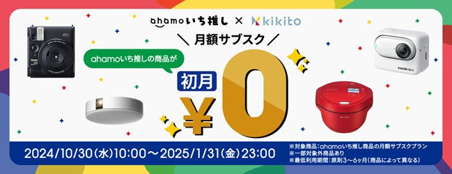 株式会社NTTドコモ(以下、ドコモ)は、家電を気軽にお試しいただける家電レンタル・サブスクサービス「kikito」にて、デジタルネイティブ世代の趣味趣向に寄り添った商品※1の月額サブスクプランを初月無料※2でご利用いただける「ahamoいち推し×kikito」初月無料キャンペーン(以下、本キャンペーン)を2024年10月30日(水)から2025年1月31日(金)までの期間で開催します。「ahamoいち推し」とは、デジタルネイティブ世代の趣味趣向に寄り添った商品を提案する新たな取り組みです。