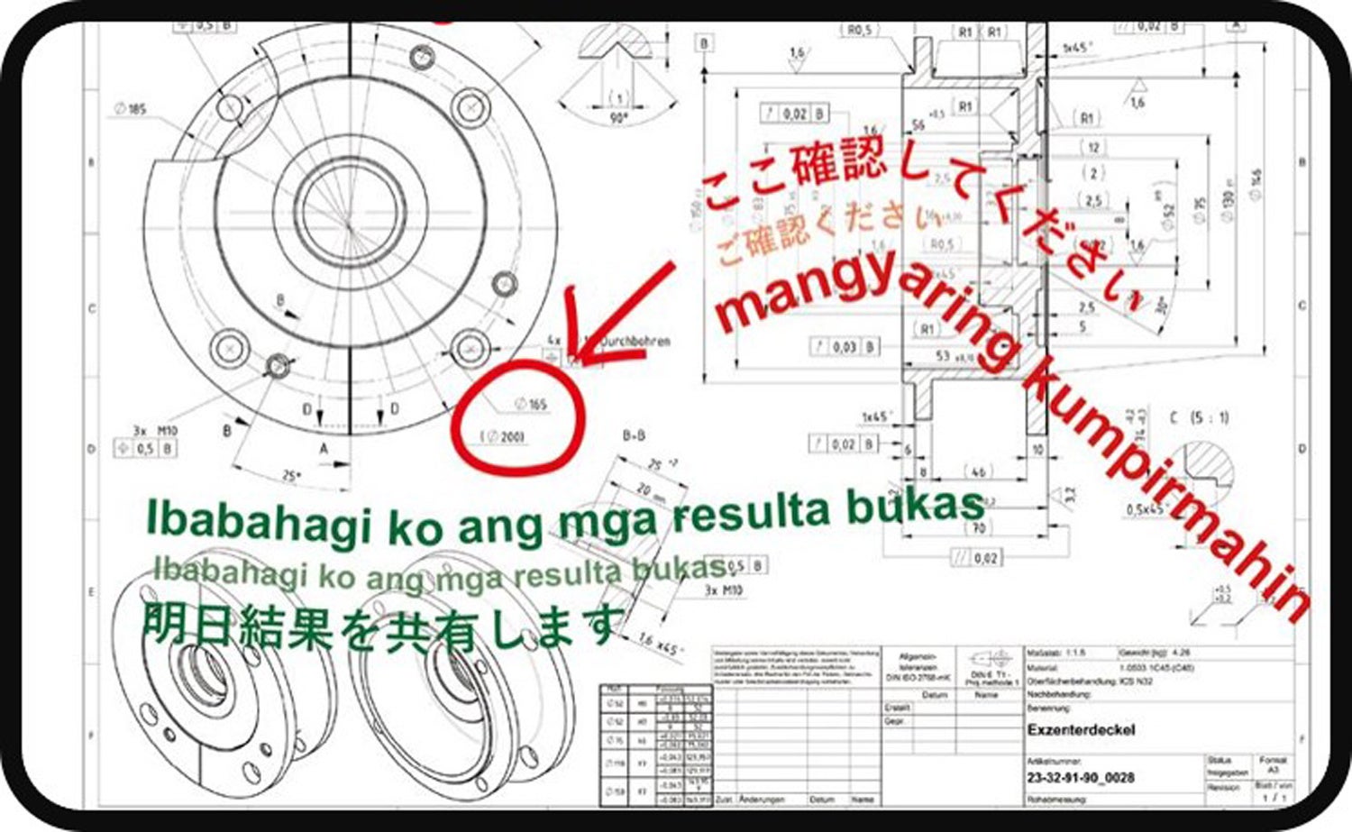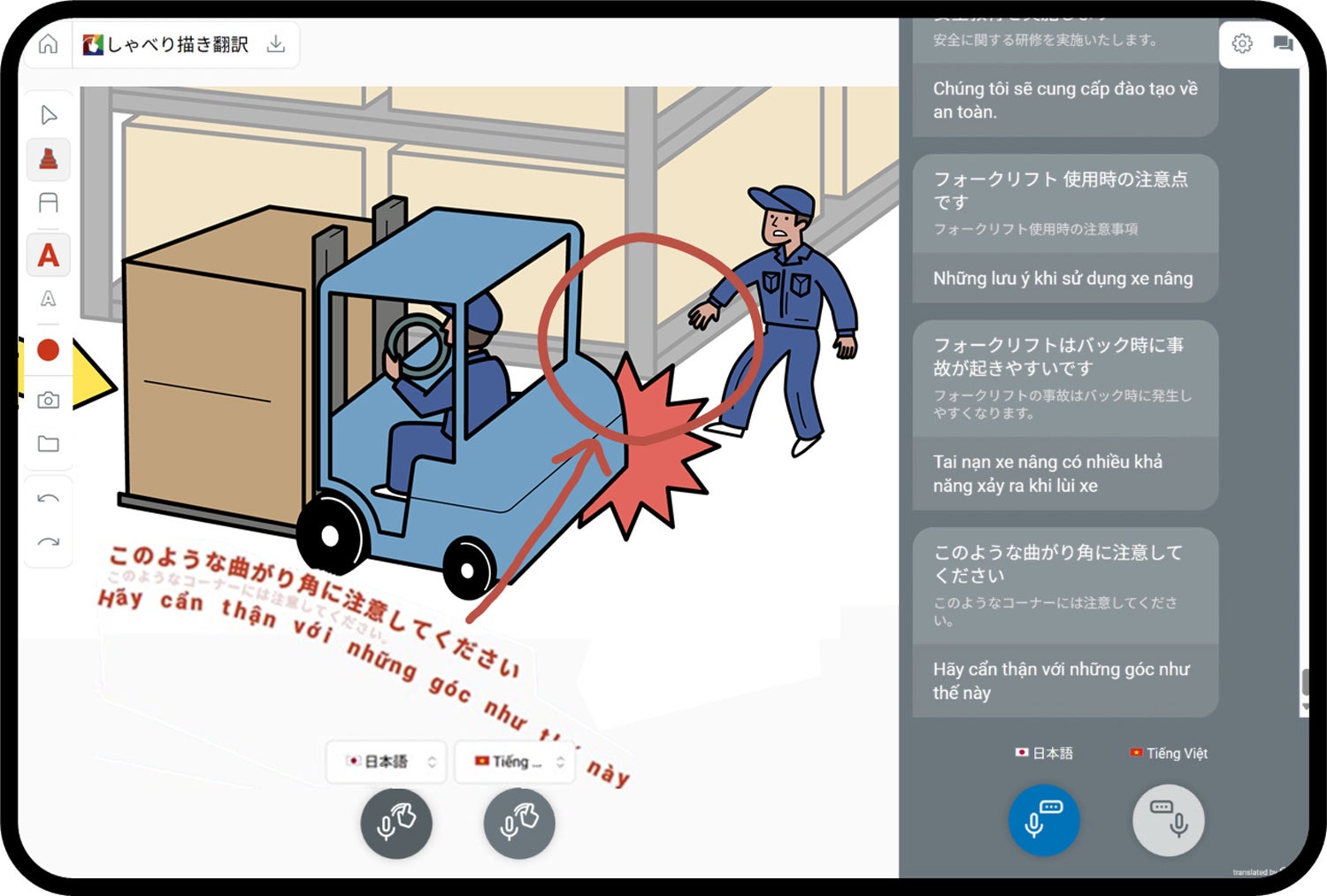 ・従来は外国籍労働者への伝達が難しかった作業要領書や図面を用いた説明などにおいても、書類や画像に文字を組み合わせて表示することができるため、情報伝達・理解を視覚的にサポート(図2)