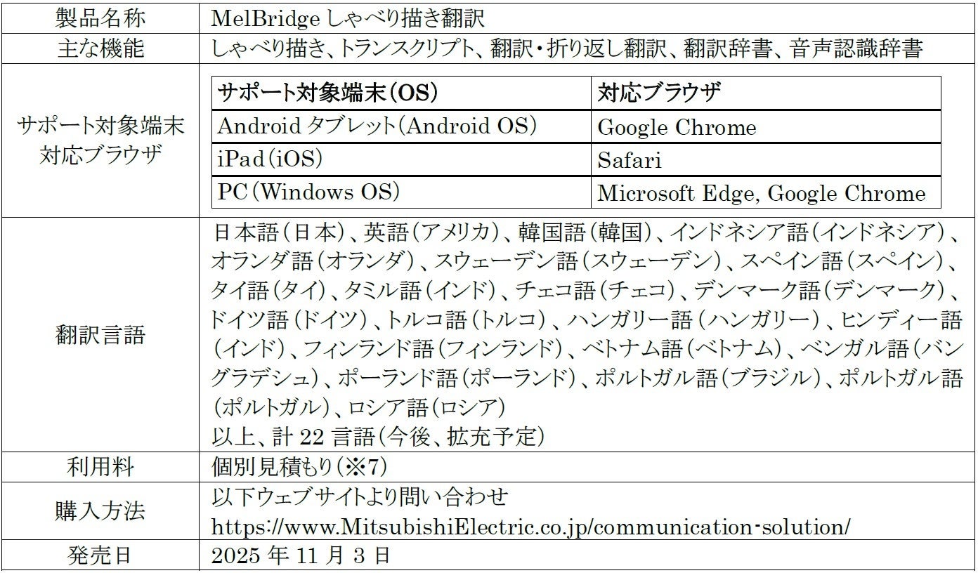 三菱電機株式会社は、生産現場における外国籍従業員との円滑なコミュニケーションの実現に向けて、話した言葉をタブレット端末の画面上に翻訳して表示することで正確な情報伝達を可能とし、作業品質や安全性の向上などに貢献する「MelBridge(メルブリッジ)(※1)しゃべり描き翻訳TM(以下、しゃべり描き翻訳)」を、サブスクリプション型サービス(月額)として11月3日に発売します。