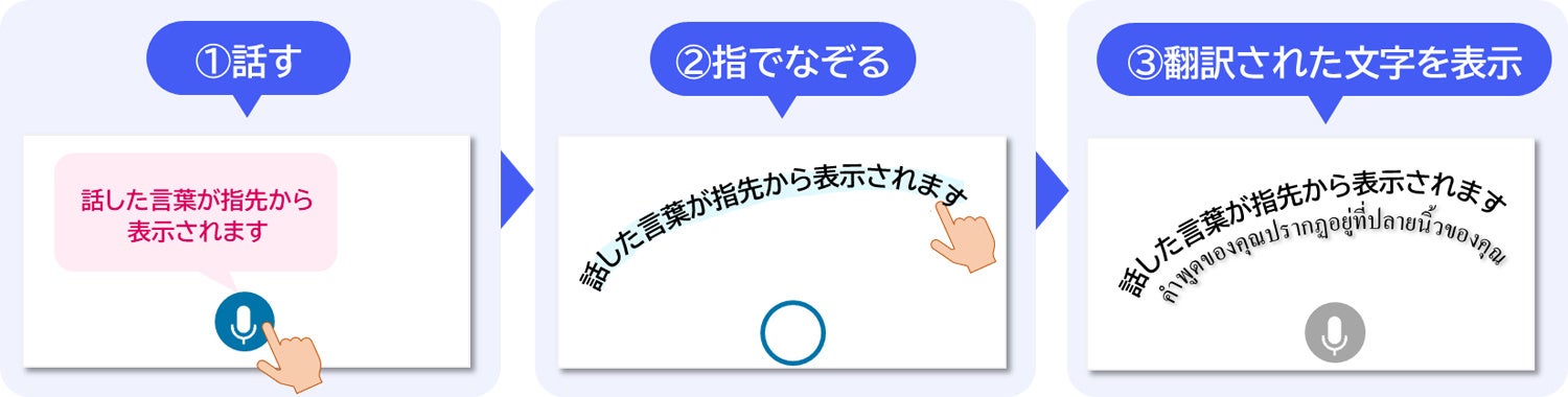 ・話した言葉を、画面を指でなぞった軌跡上に文字で表示する「しゃべり描き機能」と「翻訳機能」との組み合わせにより、画面上の好きな場所に翻訳された文字を配置(図1)