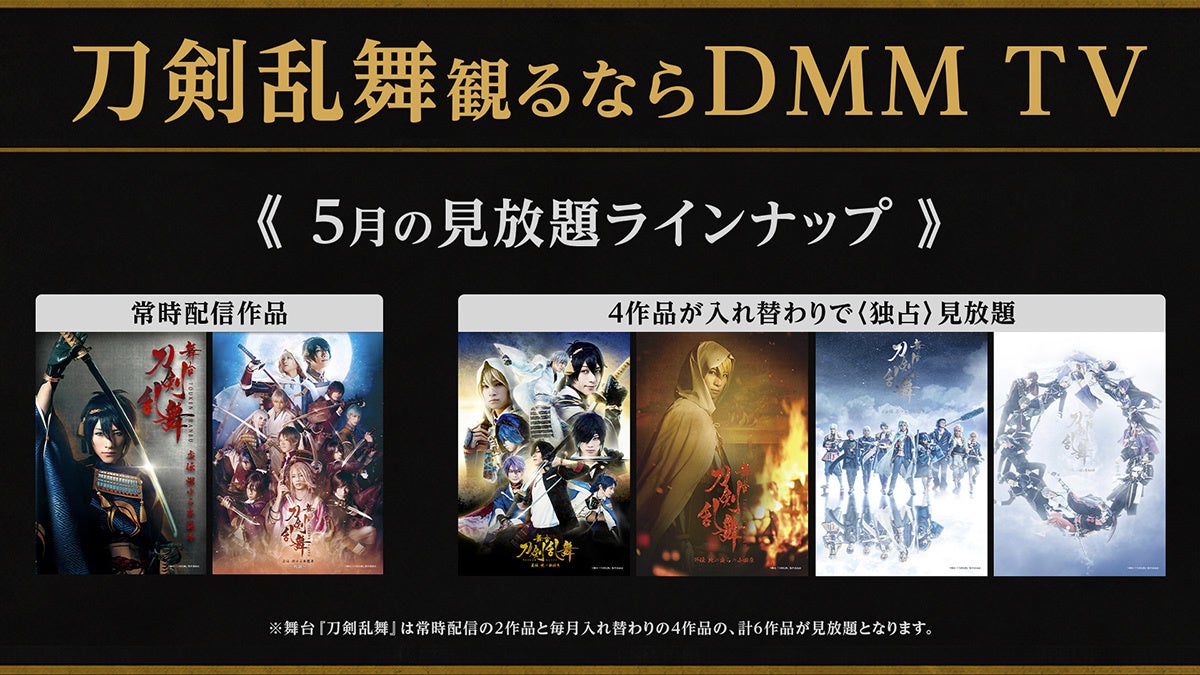 DMM TVにて、PCブラウザ・スマホアプリゲーム「刀剣乱舞ONLINE」を原案に末満健一が脚本・演出を手掛けたストレートプレイ版の舞台化作品となる舞台『刀剣乱舞』シリーズより毎月6作品の見放題独占配がスタート!