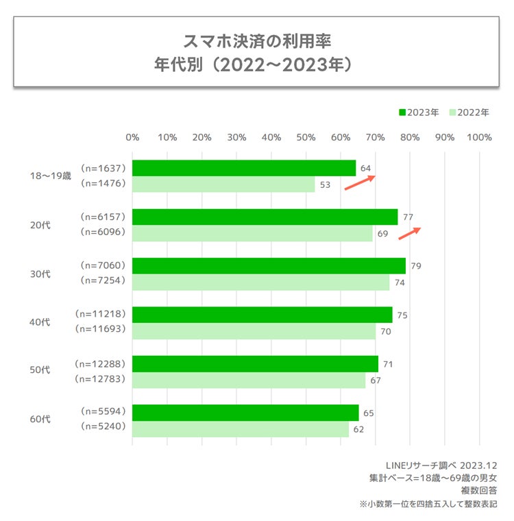 「スマホ決済」の利用率はすべての年代で上昇傾向にあり、その中でも10代では、昨年から12ポイント、20代では、7ポイントの上昇がみられました。