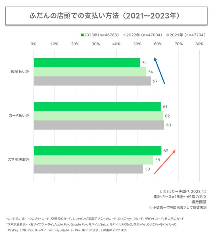 「スマホ決済派」は年々上昇傾向にあり、2021年から9ポイント上昇しました。一方「現金払い派」は減少傾向にあり、2021年から5ポイント減少しました。また、「カード払い派」はこれまでの推移をみても6割台と大きな変化はみられませんでした。