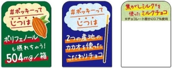 「ポッキーチョコレート」と「ポッキー<極細>」は各4種類、「ポッキーTASTY」は1種類の「じつは」を記載したPOPシール付きキャンペーン品を発売します。