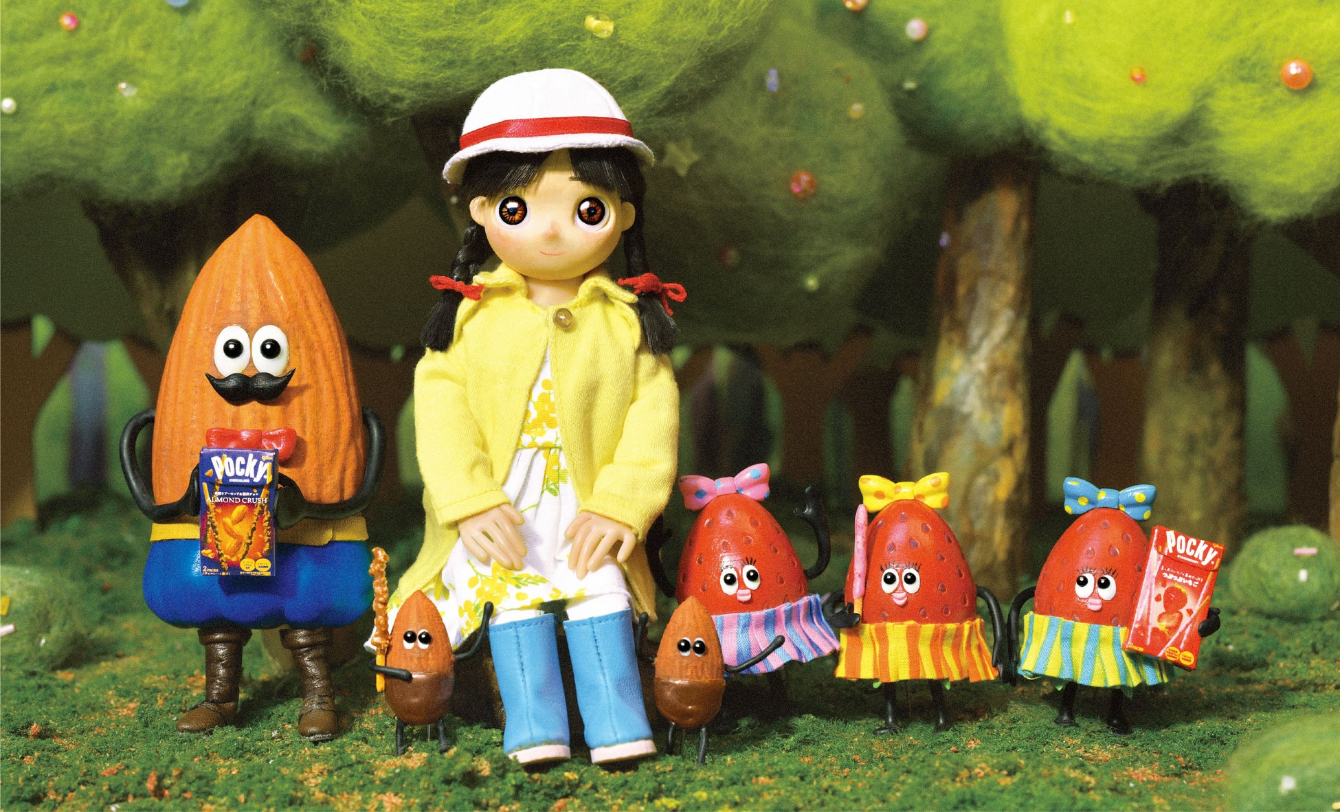 「ポッキー」2品のリニューアルに合わせ、「つぶつぶいちごポッキー編」、「アーモンドクラッシュポッキー編」の2作品を公開します。ポッキーが大好きな女の子が、いちごの3姉妹や、ダンディなアーモンドと小さくてかわいいアーモンド達に囲まれて、「じつはね・・・」と秘密を教えてもらいながら、新しくなった「ポッキー」を分けてもらいます。人形たちは手作りで、コマ撮りならではの可愛らしい動きが特徴的なムービーに仕上がりました。