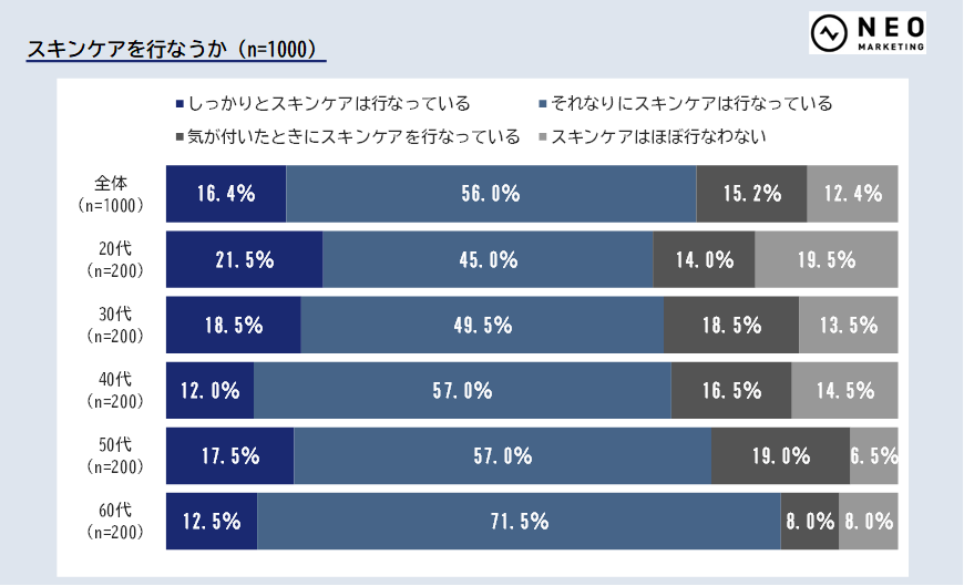 その結果、「しっかりとスキンケアは行なっている」と回答したのは16.4%といった結果となりました。最も多い回答は「それなりにスキンケアは行なっている」と回答した人となり56.0%が回答しています。