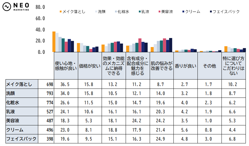 「メイク落とし」や「洗顔」など多くの項目で「使い心地・感触が良い」ことを最も重視している人が多いものの、「美容液」と「クリーム」は「肌の悩みが改善できる」という効果を重視している人が多いことがわかりました。医薬部外品など有効成分が配合された美容液やクリームなどが肌悩みの対策として注目されるのではないでしょうか。