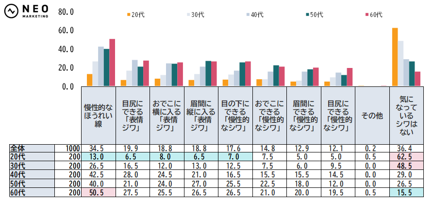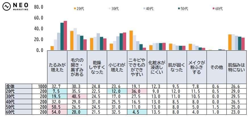 20代は「ニキビやできものができやすい」、30代は「毛穴の開き・黒ずみがある」などの肌荒れへの悩みが、50代、60代は「たるみが増えた」などのシワ・たるみへの悩みが全体より高い数値となっています。