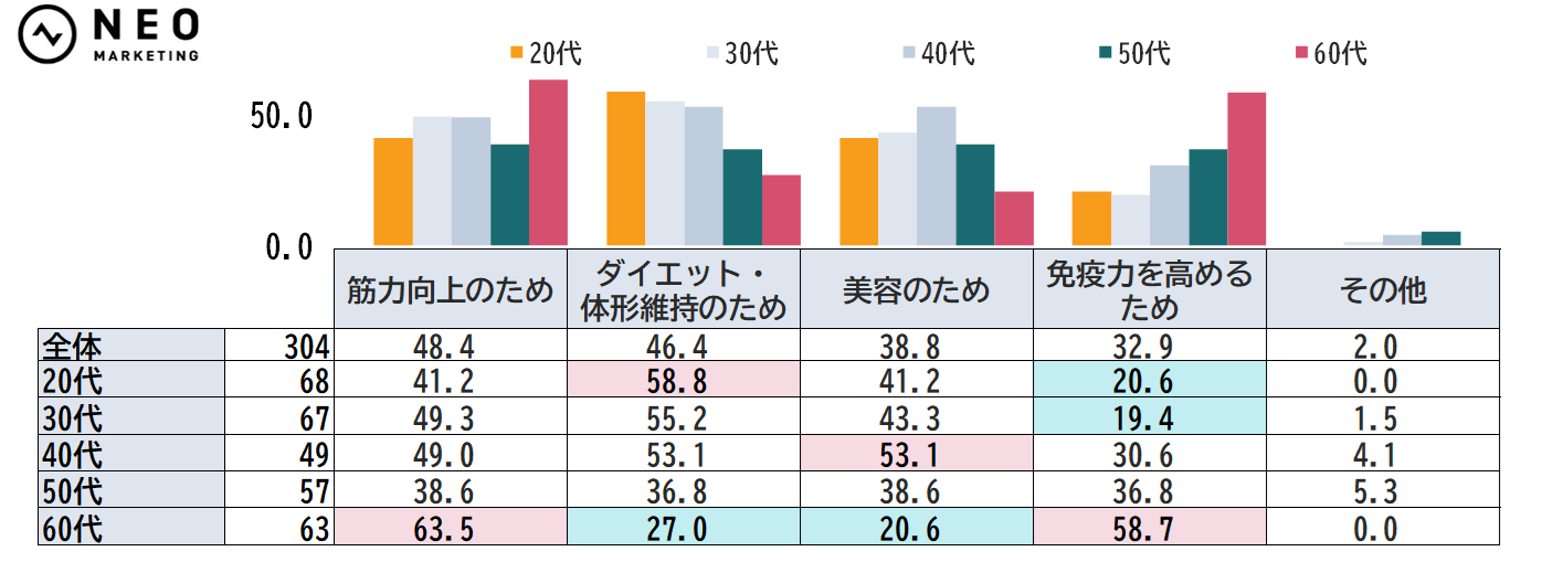 プロテイン関連商品を「数カ月に1回以上摂取する」と回答した方のうち、摂取する目的は「筋力向上のため」が48.4%で最多。しかし、肌質や髪質の維持・改善など「美容のため」と回答した方も4割近くいる結果。