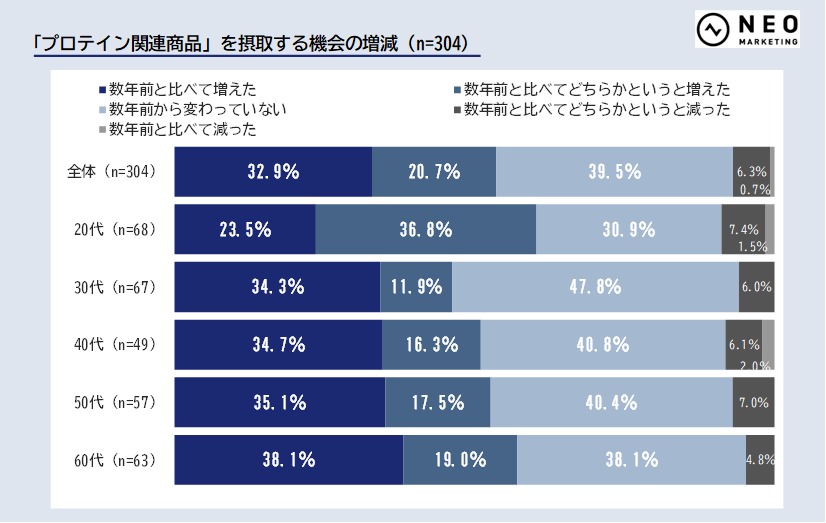 プロテイン関連商品を「数カ月に1回以上摂取する」と回答した方に、摂取の頻度を数年前と比較してもらうと、計53.6%が増えたと回答。特に20代は計60.3%が増えたと回答し、若年層を中心にプロテイン関連商品が注目されていることが改めてわかった。