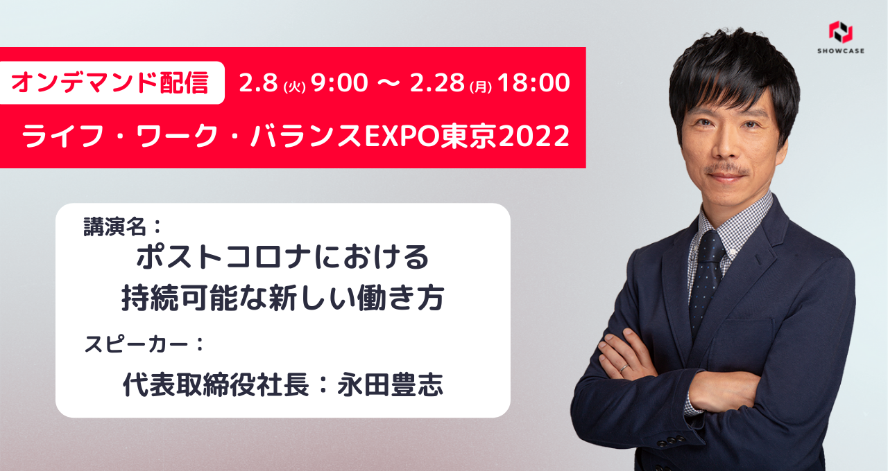 企業と顧客をつなぐDXクラウドサービスを展開する株式会社ショーケース(東京都港区、代表取締役社長:永田豊志、証券コード:3909、以下ショーケース)は、東京都が主催する「ライフ・ワーク・バランスEXPO東京2022」にて代表取締役社長:永田が講演することをお知らせいたします。