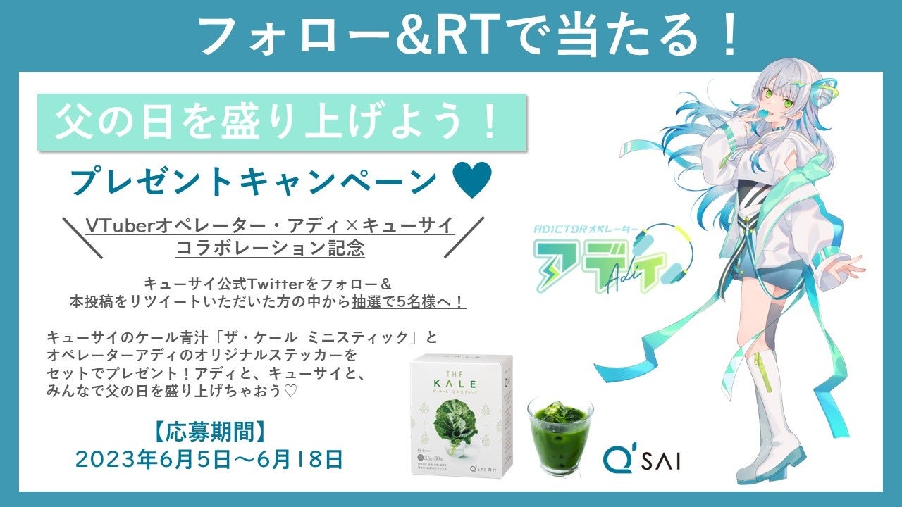 このコラボレーションを記念して、キューサイ公式Twitterではキャンペーンを開催いたします。キューサイ公式Twitterをフォローしていただき、当アカウントにて投稿される本キャンペーン投稿を6月5日~6月18日の期間中にリツイートいただいた方の中から5名様に、オペレーター・アディのオリジナルステッカーと本動画でご紹介したキューサイのケール青汁「ザ・ケール ミニスティック」をセットでプレゼントいたします。