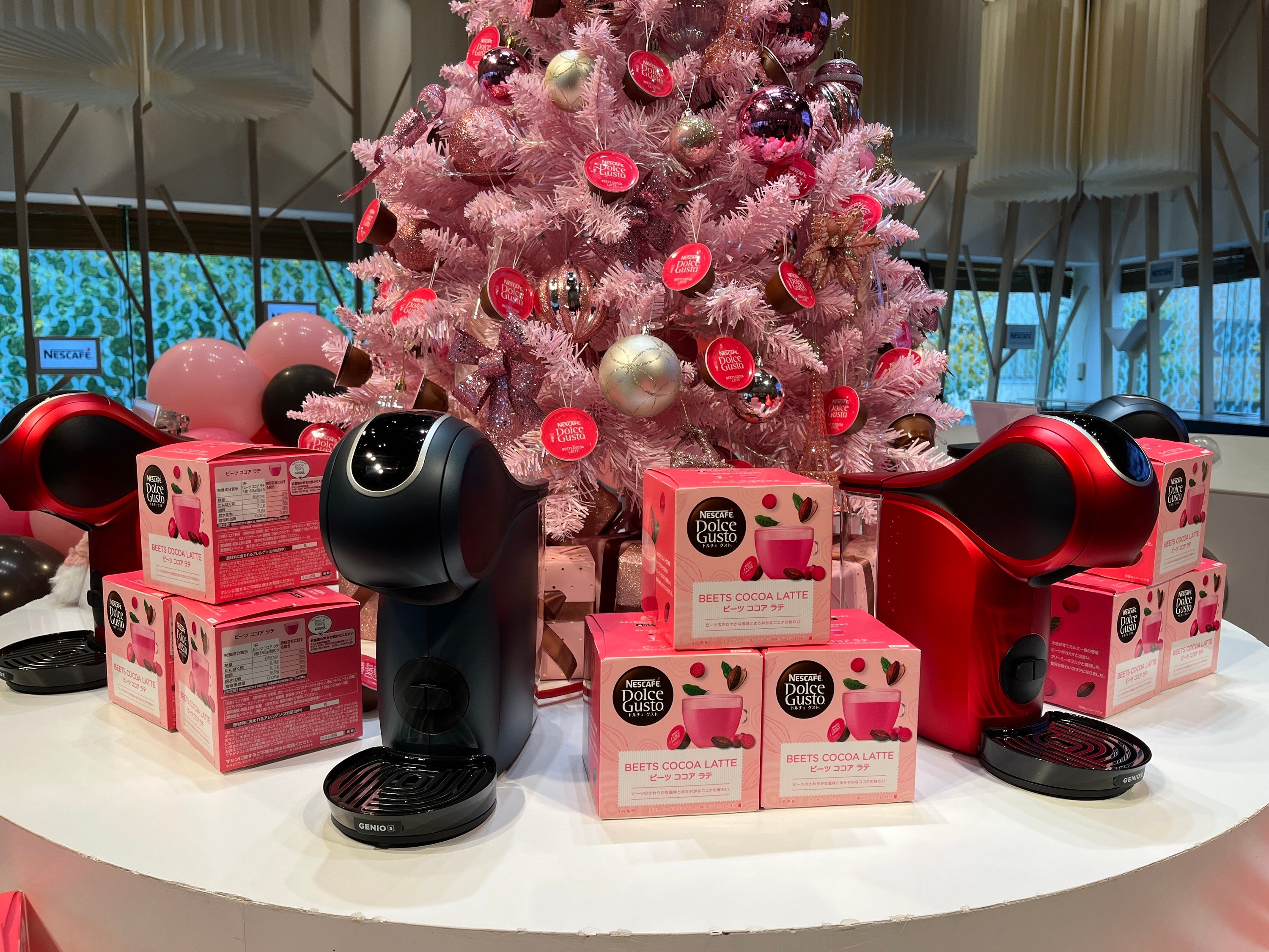 さらに、12月1日(木)から12月25日(日)までの期間は、ピンク色が特徴の「ネスカフェ ドルチェ グスト ビーツ ココア ラテ」をイメージしたクリスマスツリーをカフェ店内中央に設置し、華やかな装飾とともに、ホリデーシーズンを盛り上げます。