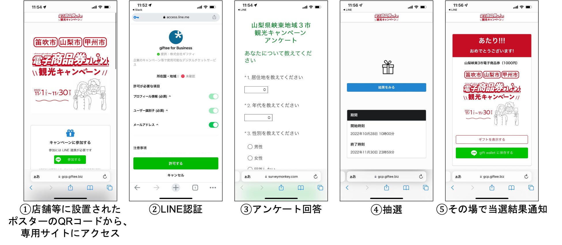 「山梨峡東3市電子商品券」は、2022年11月1日(火)から30日(水)の期間中に「山梨峡東3市観光キャンペーン」の当選者を対象に付与される500円~5,000円分の電子商品券です。発行総額は40万円を予定しており、笛吹市・山梨市・甲州市3市内の来訪者を対象に実施されます。3市内の加盟店舗内等に掲示されたアンケート回答用のQRコードをスマートフォンで読み込み、3市の観光に関する10問のWEBアンケートに回答いただくとキャンペーンに参加いただけます。アンケート回答後は、抽選結果がすぐに表示され、当選した場合はその場で電子商品券を受け取ることができます。