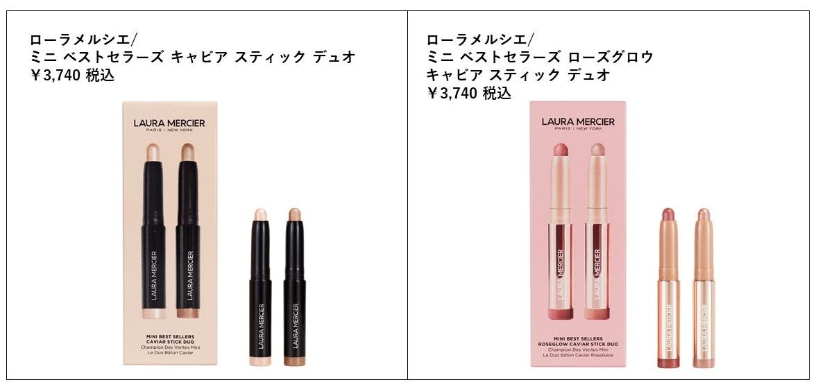 今回の@cosme BEAUTY DAYではローラメルシエ「キャビアスティック アイカラー」より、定番人気の使いやすいカラー2色のミニサイズをセットにした「ミニ ベストセラーズ キャビア スティック デュオ」と、「ローズグロウコレクション」から人気の2 色をセレクトした「ミニ ベストセラーズ ローズグロウ キャビア スティック デュオ」のリ2種類のホリデー限定セレクションが最速先行発売となります。持ち運びやトライアル・プチギフトにもおすすめです。