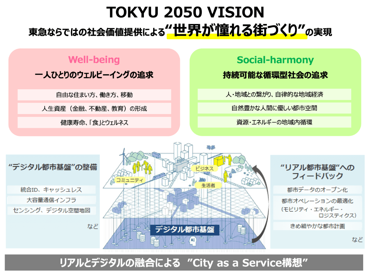 TOKYU 2050 VISIONとは、東急が2019年9月に公表した、長期経営構想(2030年までの経営スタンスおよびエリア戦略・事業戦略などを取りまとめた経営構想)において言及した、2050年に東急グループがありたい姿を表現したVISIONです。