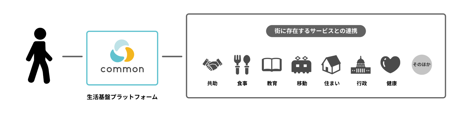 本アプリは地域共助のプラットフォームサービスとしてスタートしますが、将来的には、街の中にあるあらゆるサービスとつなげることで、一人一人のライフスタイルに応じた、地域内のさまざまな生活シーンを支える「生活基盤プラットフォーム」となることを目指しています。