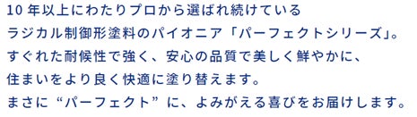 パーフェクトシリーズの真髄は、お客さまに「塗装への安心」と「住まいを守り続ける喜び」をお届けすることです。今後も、すべてのお客様にパーフェクトシリーズの素晴らしさを更にご理解いただけるよう、製品ラインナップの拡充とともに、ブランドの魅力を発信していきます。