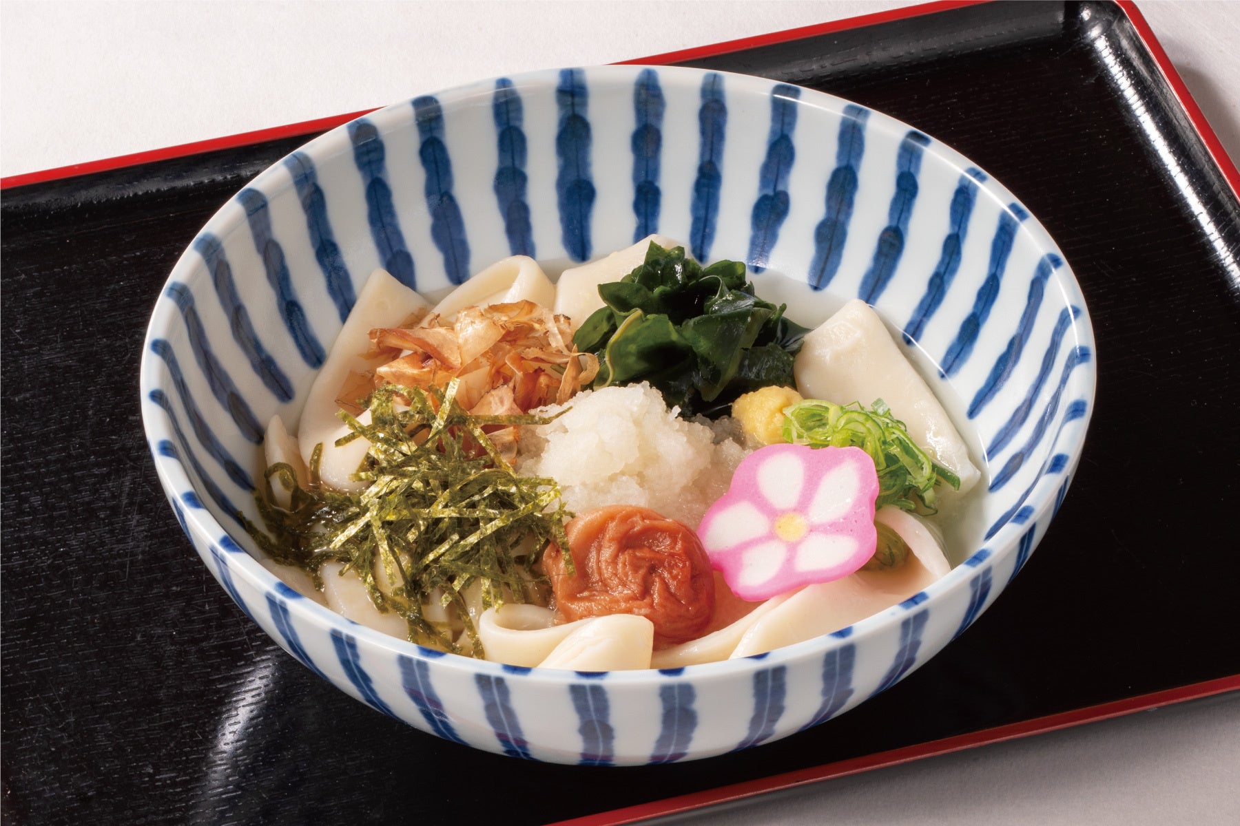さっぱりとした梅おろしがモチモチの太うどんに絡む、夏にぴったりの冷やしうどん。和の香り豊かな白だしが広がる本格的な味わいです。具材をしっかり混ぜてお召し上がりください。