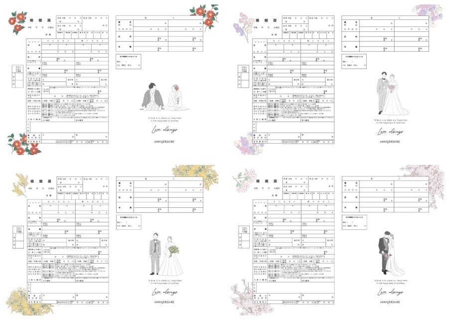 全国でゲストハウスウェディングを中心に、様々な記念日プロデュース事業を展開するアニヴェルセル株式会社は、「婚姻届のデザインにこだわりたい」、「おしゃれな婚姻届がほしい」という方に大好評の【アニヴェルセルオリジナル婚姻届】に、新デザイン4種を追加いたします。新たに登場するのは1月~4月にご入籍される方におすすめの婚姻届です。1月は椿、2月はスイートピー、3月はミモザ、4月は桜と、季節にぴったりな花のイラストが描かれ、「入籍日を季節の花で彩ってほしい」という想いを込めています。