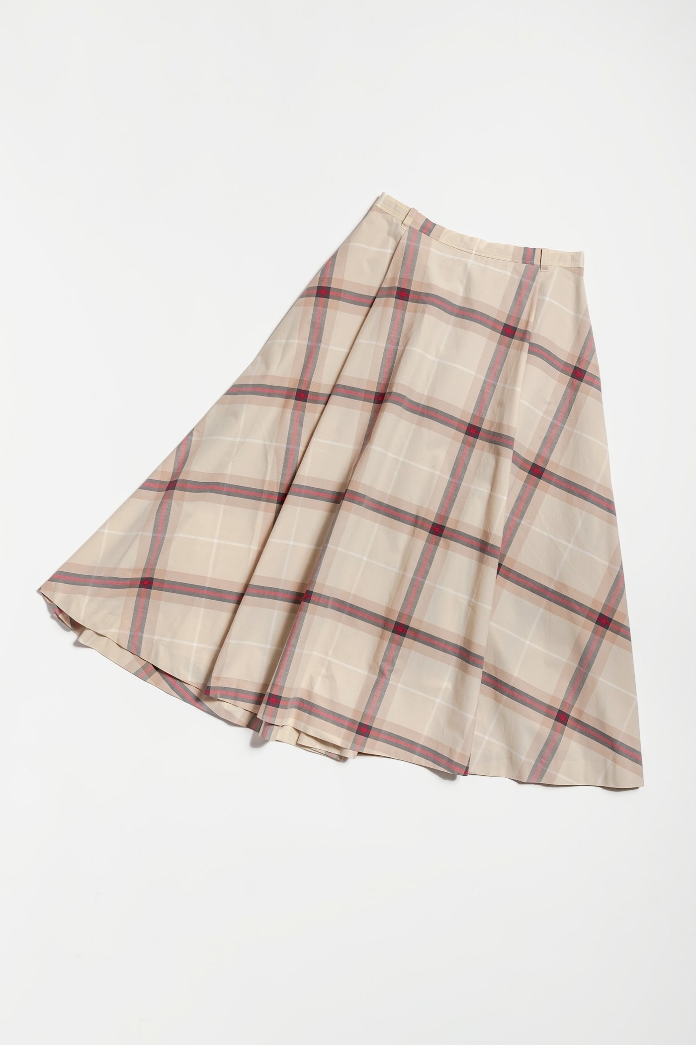 - . クラシックなチェック柄と適度なハリ感が特徴的なフレアスカート