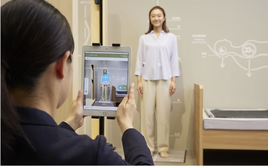 3Dボディスキャナーで全身を測定し、体の骨格や歪みなどを可視化。データに基づき、体型に合った寝具を提案。