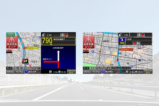 交通安全案内表示機能(画面表示on-off/音声案内on-off切替付):ゾーン30・駐車禁止取締エリア・事故多発エリア・速度取締エリア・Nシステム・オービス機能