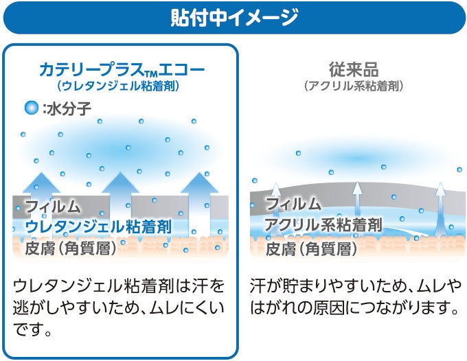 高透湿性フィルムドレッシング「カテリープラス(TM)」を使用した製品シリーズです。透湿性の高いウレタンジェル粘着剤を採用したことで、これまでにない「透湿性」(当社比)を実現し、「皮膚へのやさしさ」と「はがれにくさ」を高いレベルで両立します。