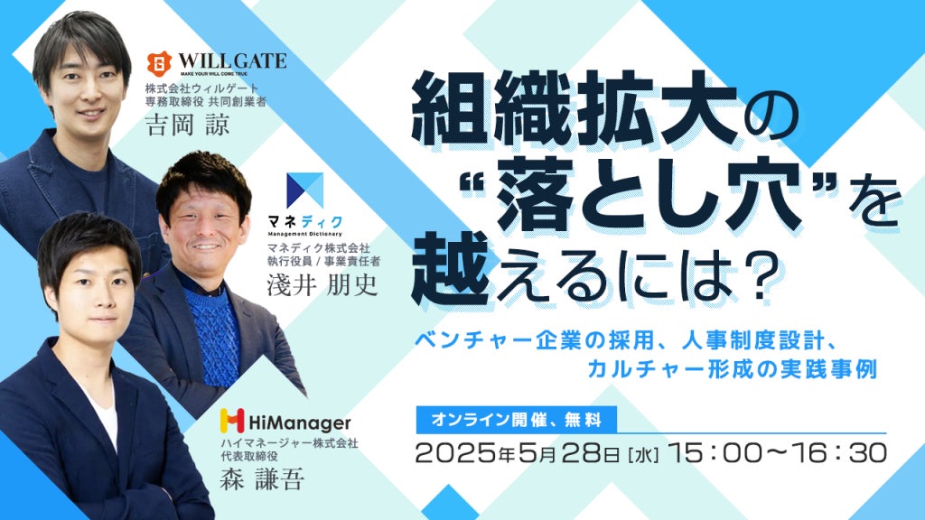 株式会社ウィルゲート(本社:東京都港区、代表取締役:小島 梨揮、以下 ウィルゲート)は、ハイマネージャー株式会社(本社:東京都渋谷区、代表取締役:森 謙吾)、マネディク株式会社(本社:東京都港区、代表取締役:末永 雄大)と合同で、『組織拡大の“落とし穴”を越えるには?─ベンチャー企業の採用、人事制度設計、カルチャー形成の実践事例』をテーマにしたオンラインセミナーを5月28日(水)に開催いたします。