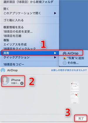 Step2、MacでiPhoneに入れたい写真を「右クリック」して「共有」から「AirDrop」をクリックします。またはツールバーの「共有」ボタンをクリックして、「AirDrop」を選択します。近くにいるAirDropユーザが示されます。