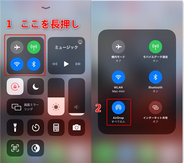 iPhoneでコントロールセンターを起動して、ネットワーク設定の四角の枠内を長押しします。AirDropの受信先は「連絡先のみ」「すべての人」から選択します。
