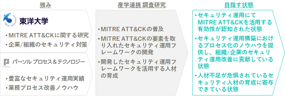 総合人材サービス・パーソルグループのパーソルプロセス&テクノロジー株式会社(東京都江東区、代表取締役社長:横道 浩一、以下「パーソルP&T」)は、東洋大学(東京都文京区、学長:矢口悦子)とともに、22年度から企業IT環境における「MITRE ATT&CK*1」を活用したセキュリティ運用改善に関する産学連携 調査研究を開始します。