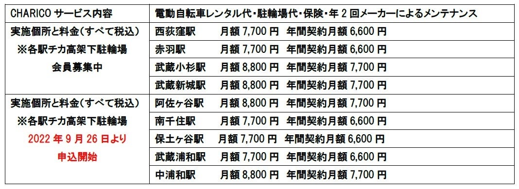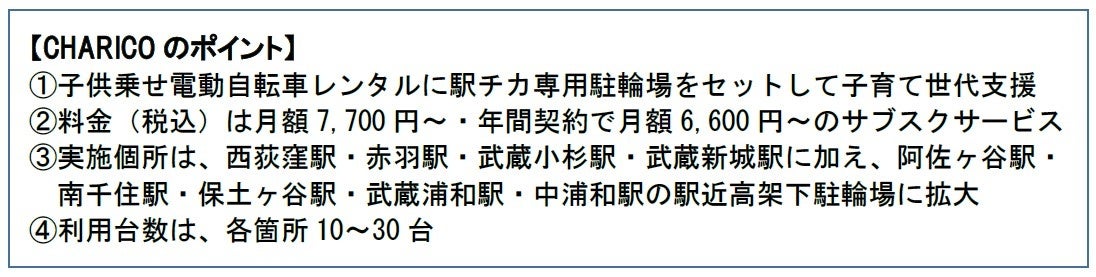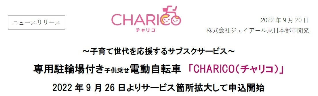 専用駐輪場付き子供乗せ電動自転車 「CHARICO(チャリコ)」 2022年9月26日よりサービス箇所拡大して申込開始