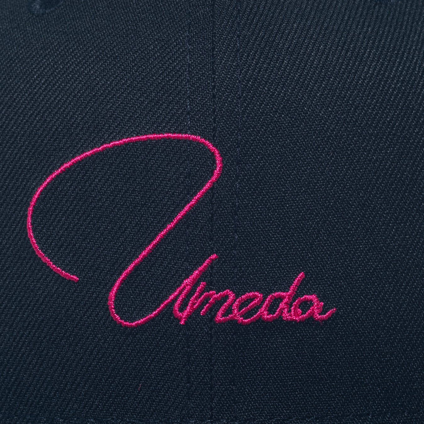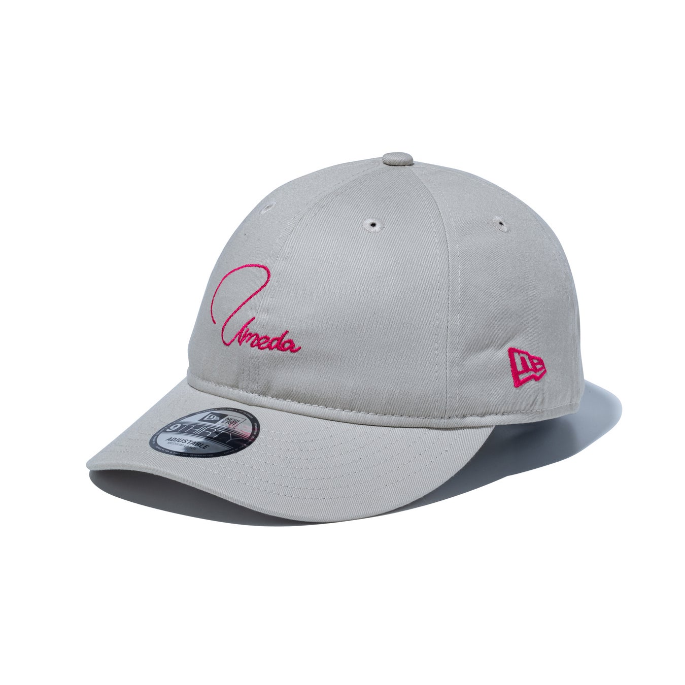 地名の「Umeda」とニューエラのフラッグロゴを、ルクア大阪のロゴカラーであるベリーレッドで刺