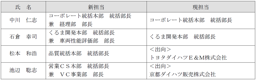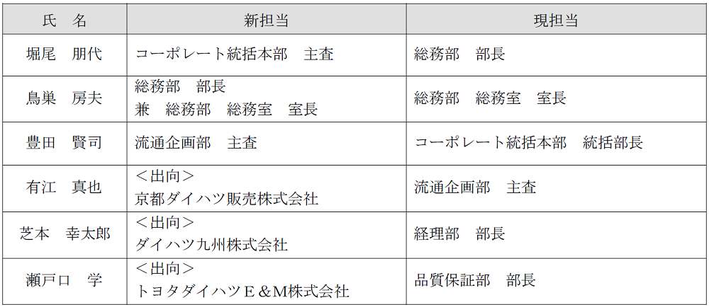 ダイハツ工業株式会社は、2023年6月1日付で下記の通り取締役の役割変更と幹部職の異動を行います。