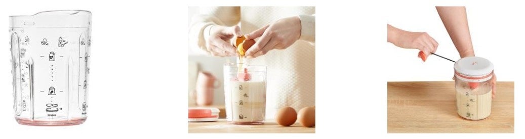 パンケーキ、クレープ、ドーナツなどの定番レシピは、容器に記載されたレシピイラスト通りに材料を入れるだけで簡単に作ることができます。また、ふたは密閉性が高いため、液状の生地を攪拌する際ももれる心配がありません。