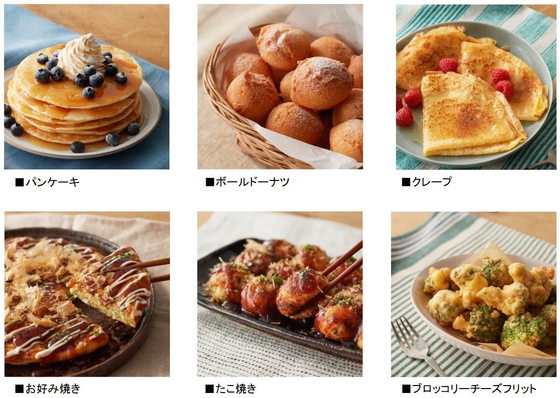 パンケーキ、クレープ、ドーナツ、お好み焼きやフリットなど、全8種類のレシピリーフレット付き。買ったその日から手軽に粉ものメニューを作ることができます。