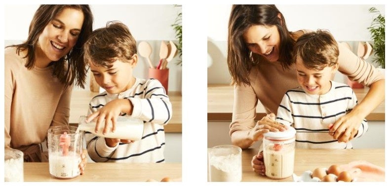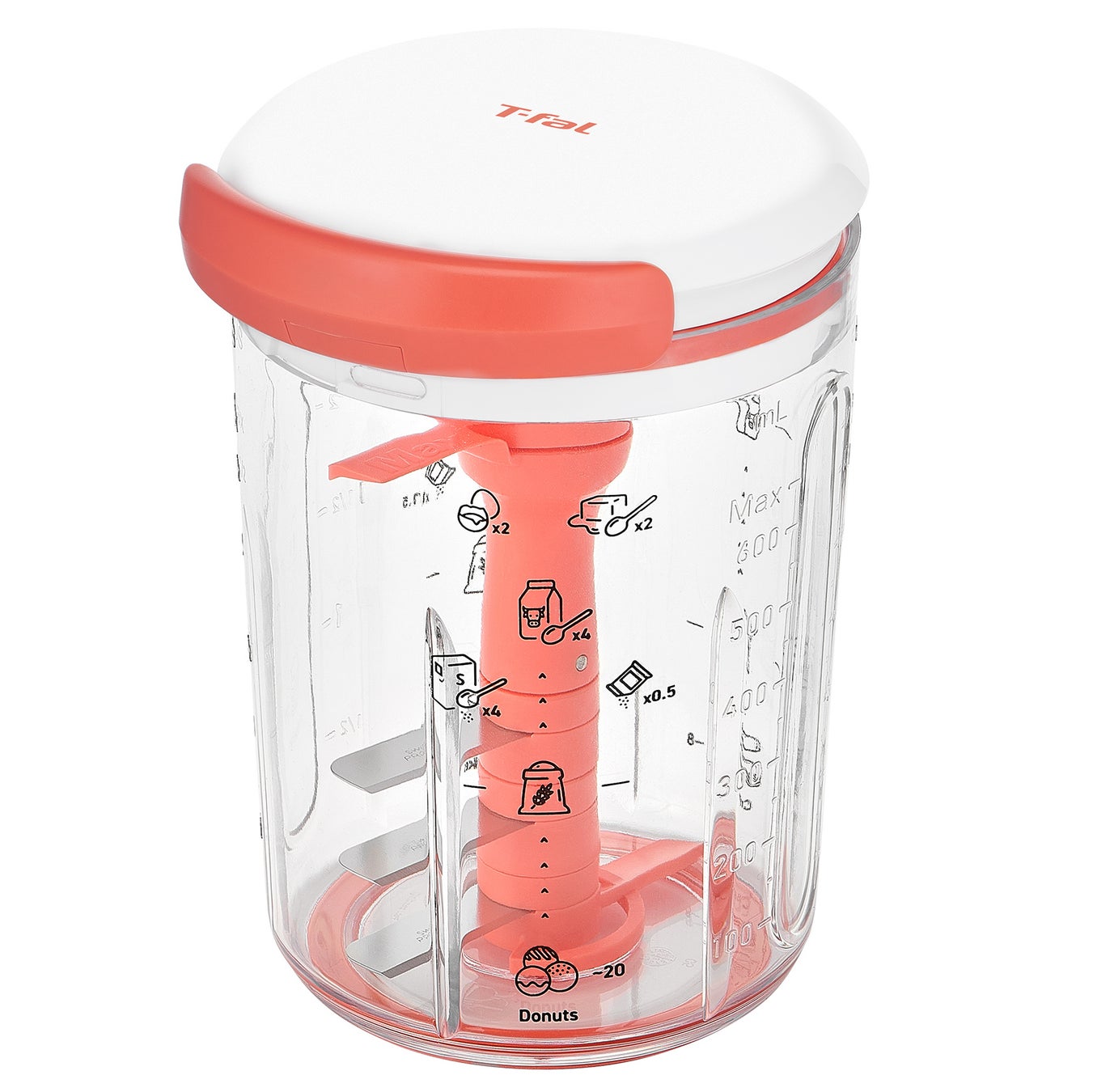 ティファール独自技術の別々に動く3枚刃により、食材や生地をスピーディにカット、撹拌することが可能。パンケーキ、クレープ、ドーナツなどの定番レシピは本体についたイラスト通りに順番に材料を入れれば、計量いらずで生地作りができます。ふたは密閉性が高いため、液状の生地を攪拌する際ももれることがなく、粉や生地が飛び散る心配もないのでお子様とのおやつ作りに最適です。容器には注ぎ口が付いているので、生地を作った後は、注ぎ口からフライパンやホットプレートに流し入れれば手間なくスムーズに調理ができてとってもラク! ボウルやスパチュラはもちろんレードルで生地をすくう必要もないため、洗いものも最小限に抑えられます。少し面倒なみじん切りや粉ものの生地作りも、「ハンディチョッパー&ミキシングエクスプレス 900ml」があればあっという間。スマート&スムーズに料理を楽しむことができます。