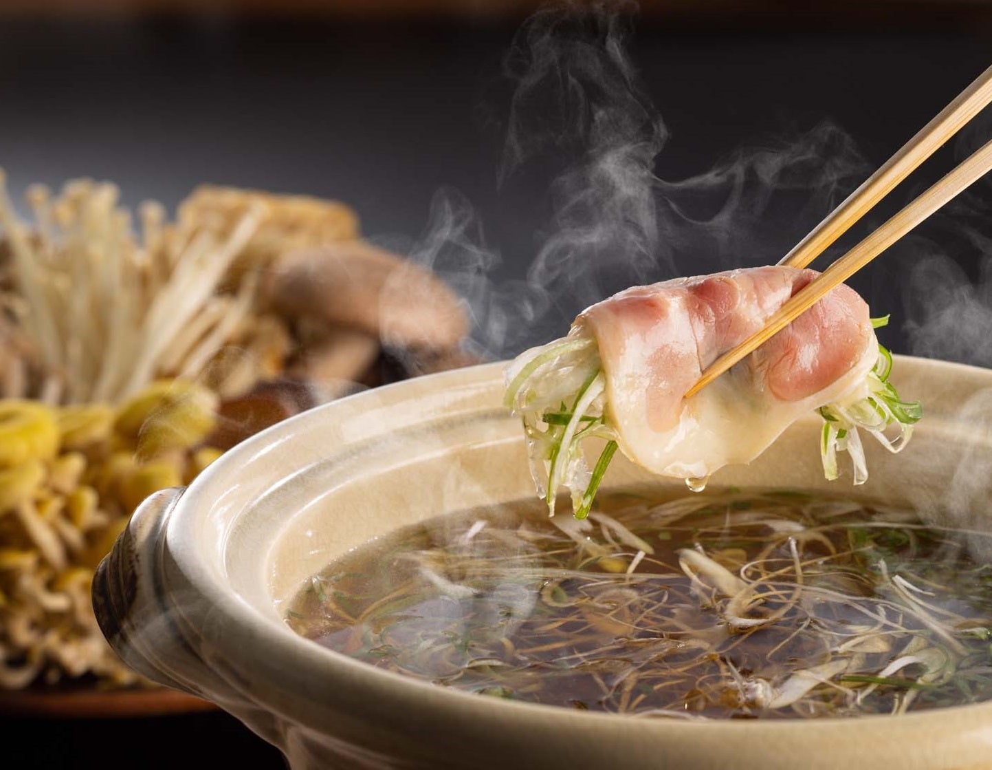 だしには職人が手で火の熱さを測り、熱量を均等にしていく伝統製法「手火山式焙乾(てびやましきばいかん)」で燻した鰹節を使用。鰹節が焦げないギリギリの高温で表面を燻すことで味を閉じ込め旨味を凝縮させています。そこに昆布・椎茸を重ねることで上品かつ芳醇な仕上がりに。口当たりがまろやかでしっとりとした肉質の鴨肉に合うよう、2種の魚介や本みりんで甘さを加えました。- 「鴨しゃぶ」の楽しみ方