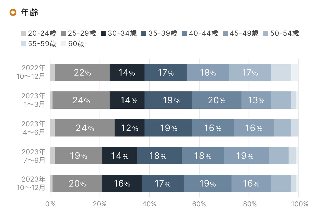2023年10〜12月度における成約顧客の年齢は、 25〜29歳の20%が最も割合の多い年齢帯となりました。 次に多い割合は40〜44歳の19%、続いて30〜34歳と45〜49歳が同率で17%でした。