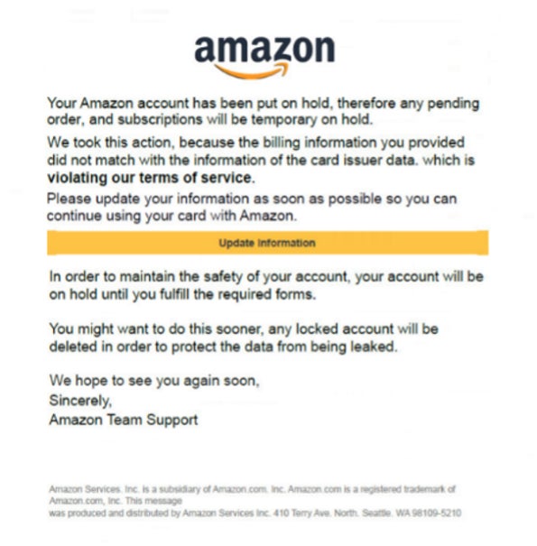 フィッシング攻撃は多くの場合、電子メールやソーシャルメディア、その他の電子的な通信手段を通じて送信される一通のメッセージから始まります。サイバー犯罪者は、ソーシャルネットワークなどのような公共のリソースを利用して被害者の背景情報を収集し、説得力のある偽メッセージを作成するのに役立てています。通常、これらのメッセージには、悪意ある添付ファイルや、Amazonのように信頼性の高い団体が所有しているように見せかけた偽ウェブサイトへのリンクが含まれています。その目的は、ユーザー名、パスワード、支払いの詳細などの個人情報を収集することです。