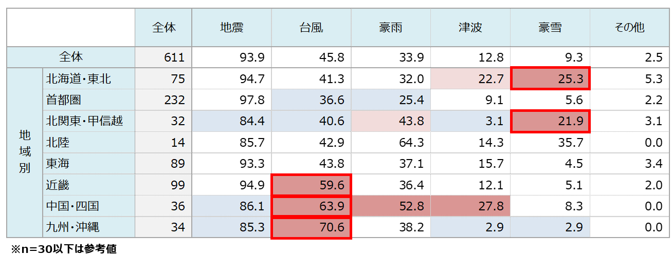 豪雪については北海道・東北や北関東・甲信越が全体より高い