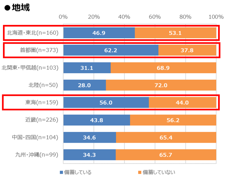 ・地域別では、最も備蓄率が高いのは、「首都圏」で62.2%、続いて「東海」で56.0%、