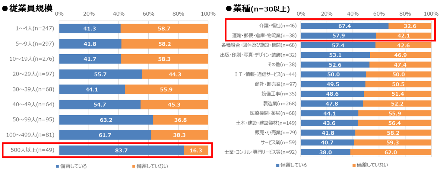 ・業種別では、最も備蓄率が高いのは、「介護・福祉」で67.4%、