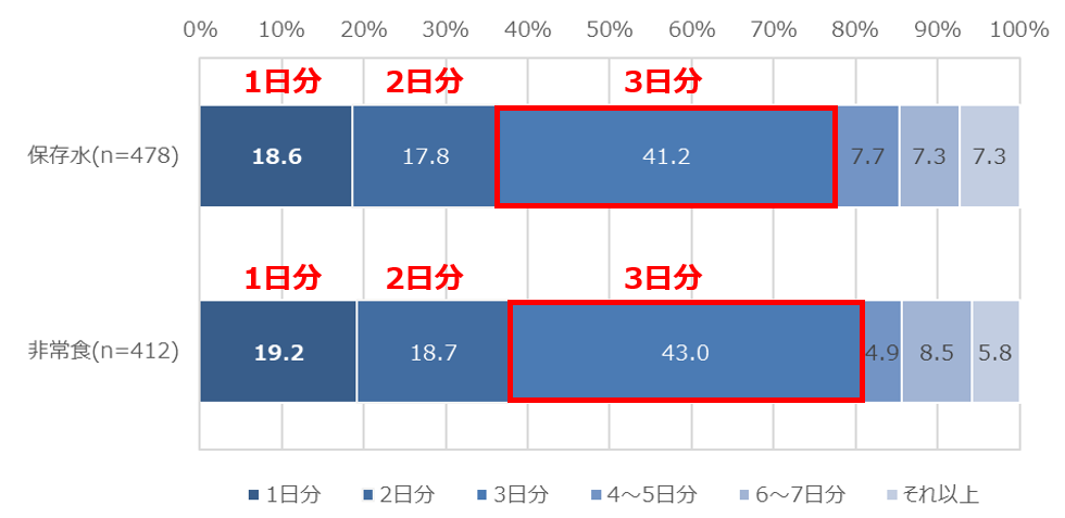 ・保存水及び非常食の備蓄量は、3日分が最も多く4割