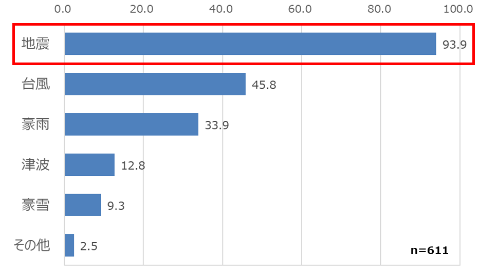 ・備蓄対象となっている災害の種類では、「地震」が最も多く9割以上